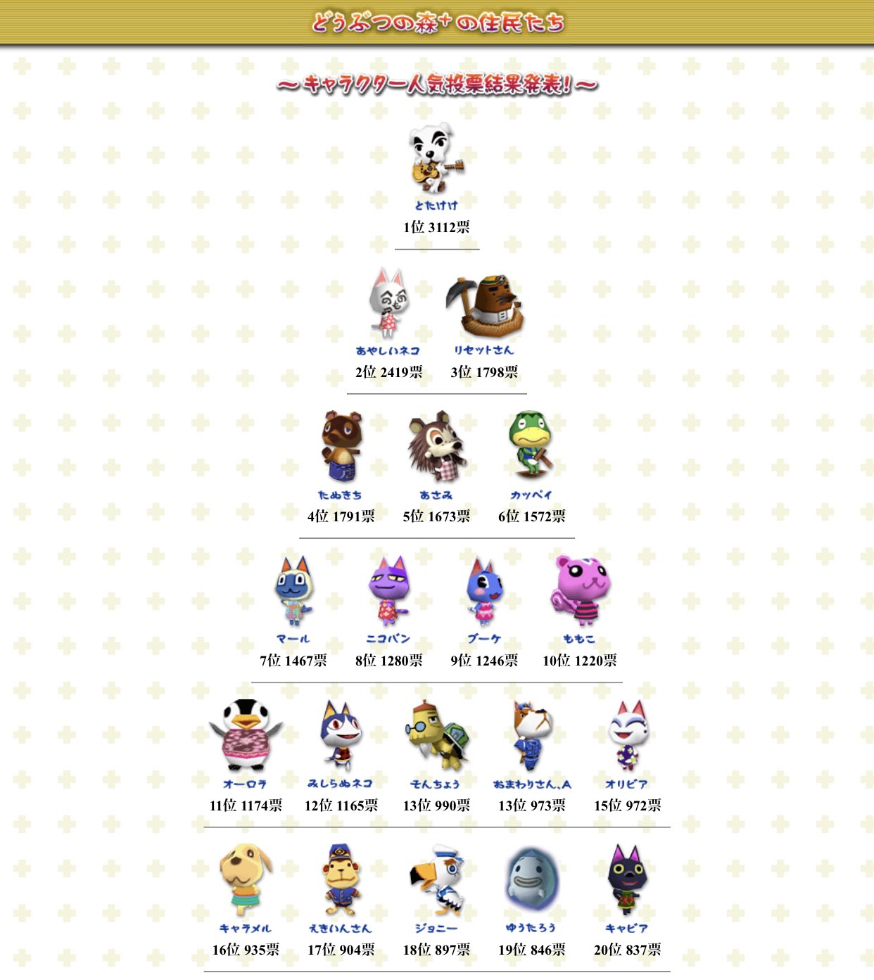 あつまれ どうぶつの森 全住民383人の人気ランキング Top10に入った