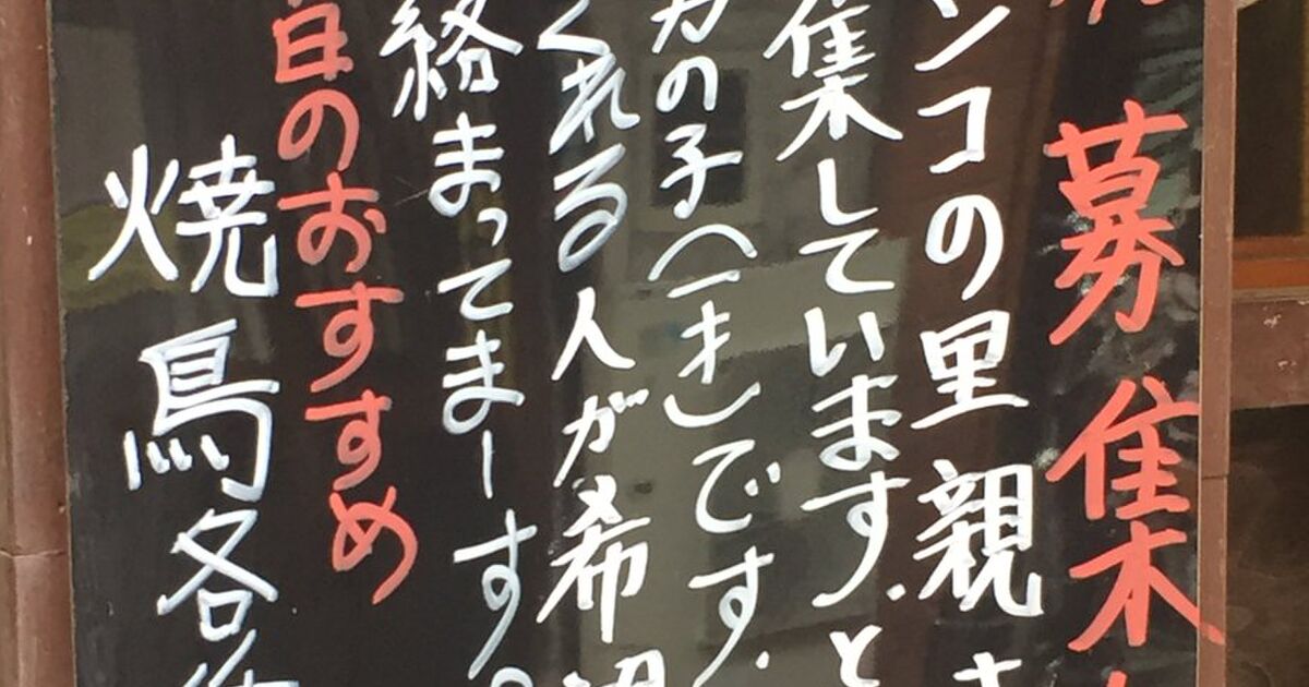 インコの里親募集の横に 本日のおすすめ 焼き鳥 じわじわくるボード