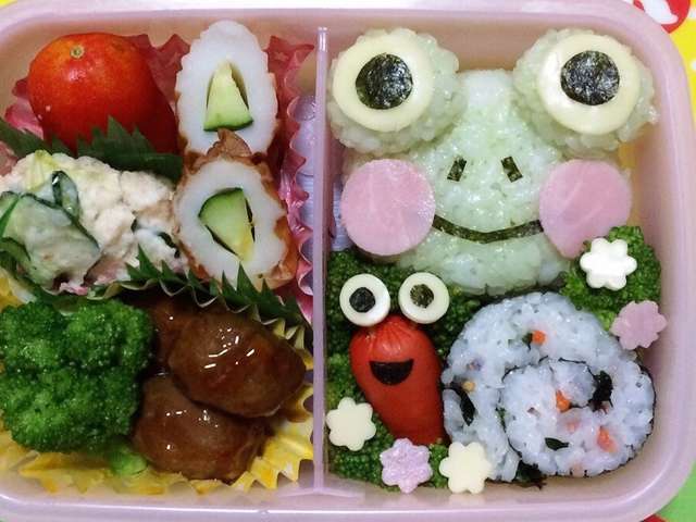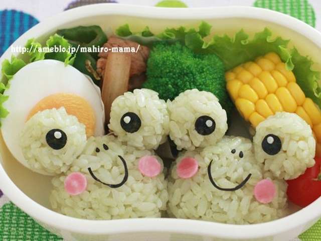 作り方 1 ご飯にすっし 緑色のふりかけなど を色が均一になるまで混ぜる 2 ラップで真ん丸おにぎりを作ります 大きなおにぎり1個と小さなおにぎり2個でカエル1つ分です 3 顔の部分をおかずと共にお弁当箱に詰めます. 6 お気に入り 27709 view. キャラ弁倶楽部 全般 お気に入り 詳細を見る.