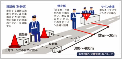 ネズミ捕りの速度測定方法 都心部は光電式 地方はレーダー式