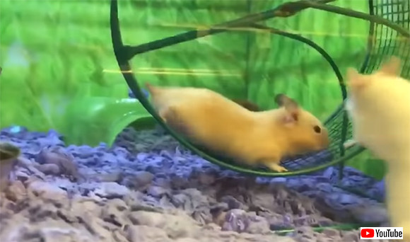 2匹のハムスターが回し車で競い合っている最中にクラッシュ発生 喧嘩