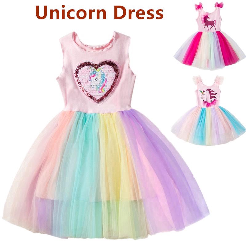 Summer 2020 Girls Unicorn Rainbow Dresses Kids Tulle Fancy Unicorn